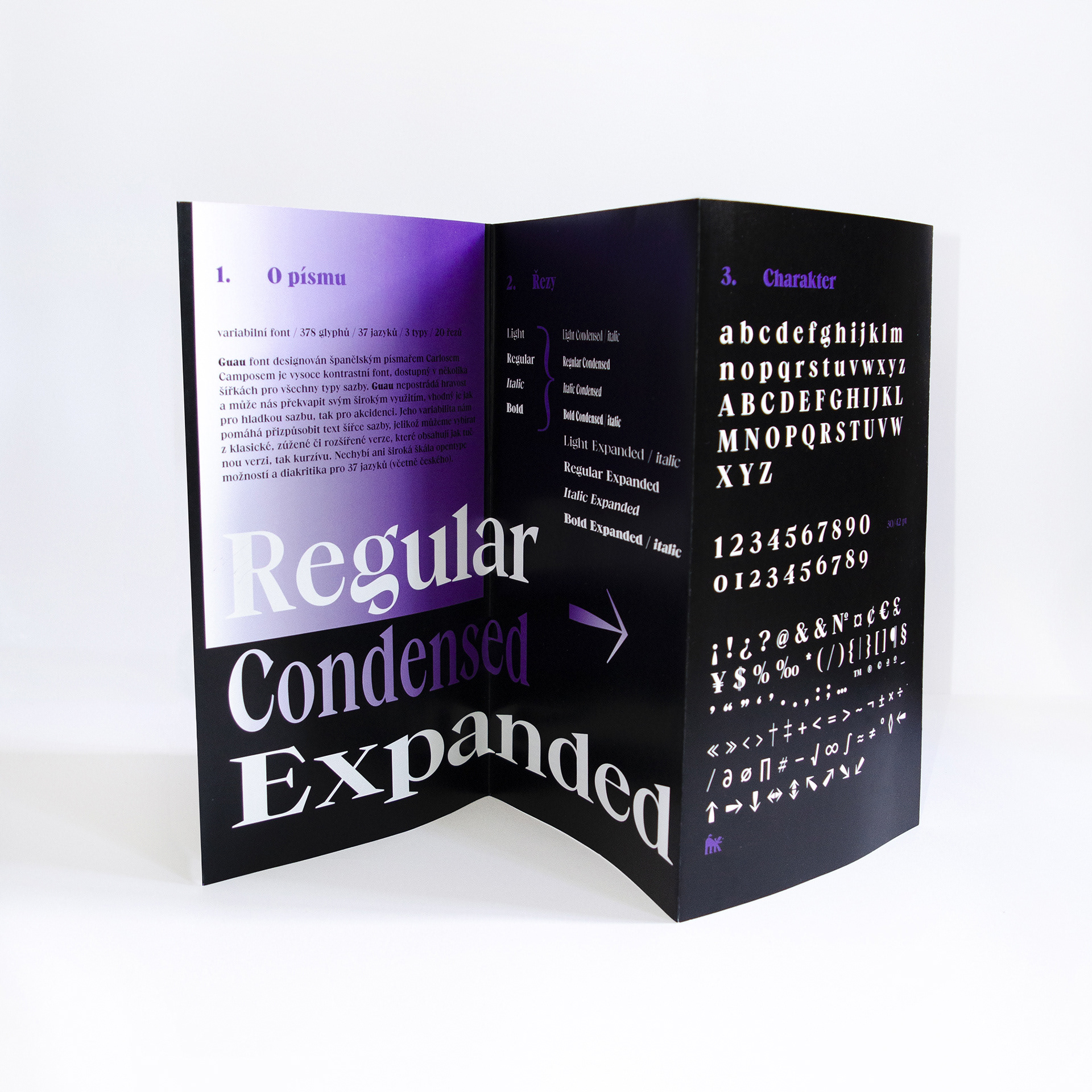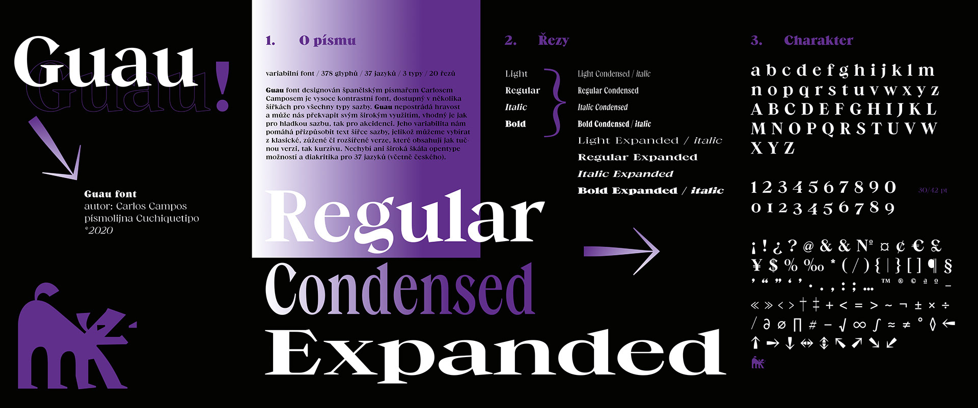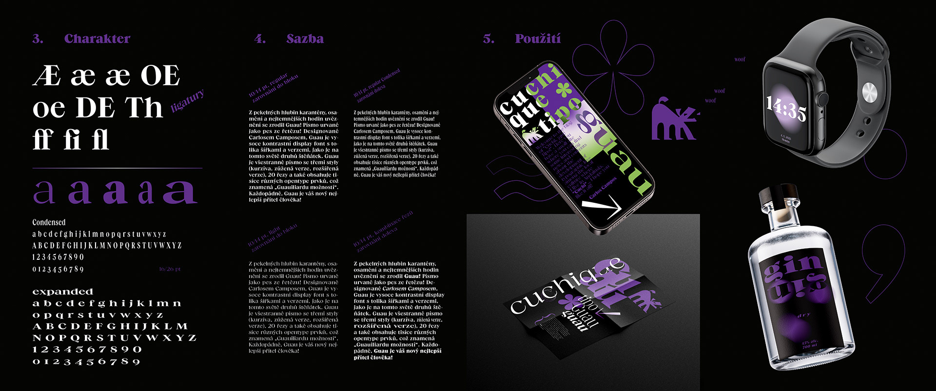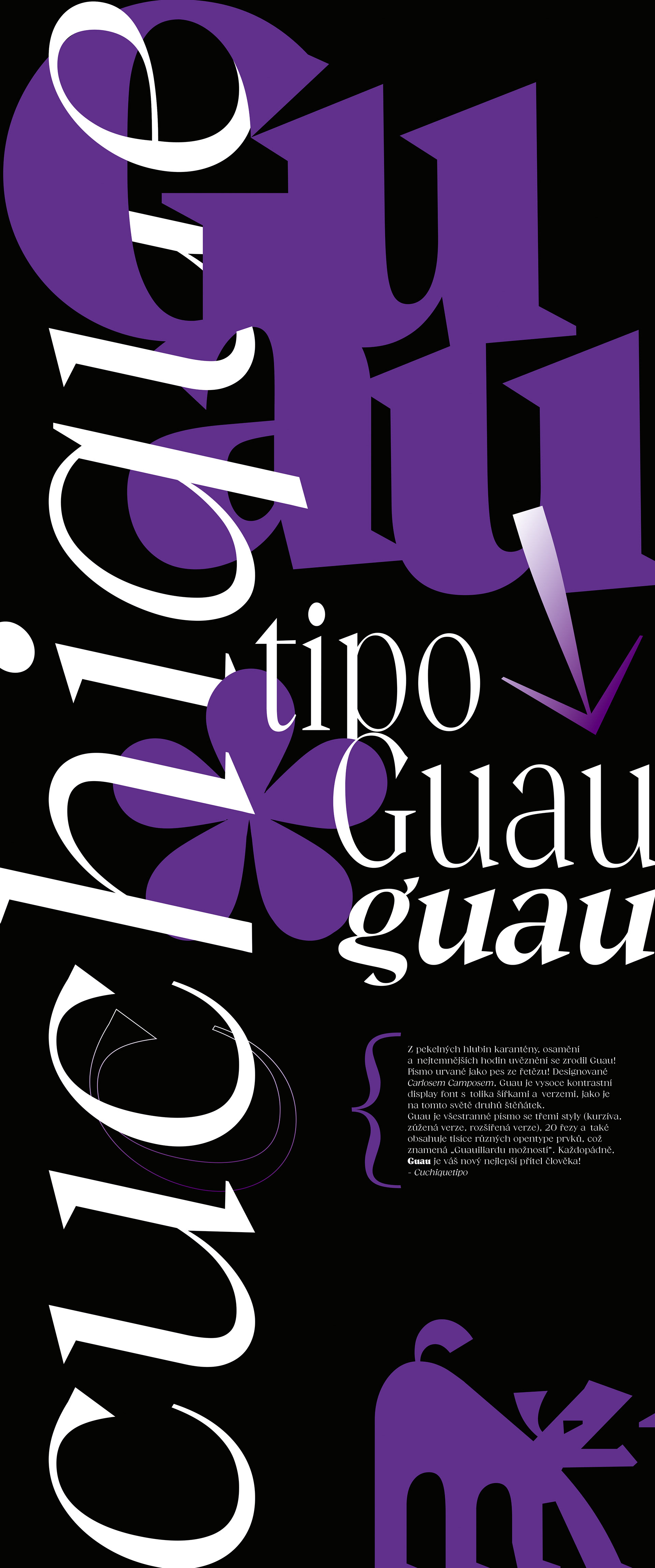 The task was to present our chosen font as a semester project in the form of a sample paper and poster. I chose a font of the Spanish type foundry Cuchiquetipo, where I tried to highlight the drawing, variability and originality of the GUAU! font and show its functionality in text and its use in practice.