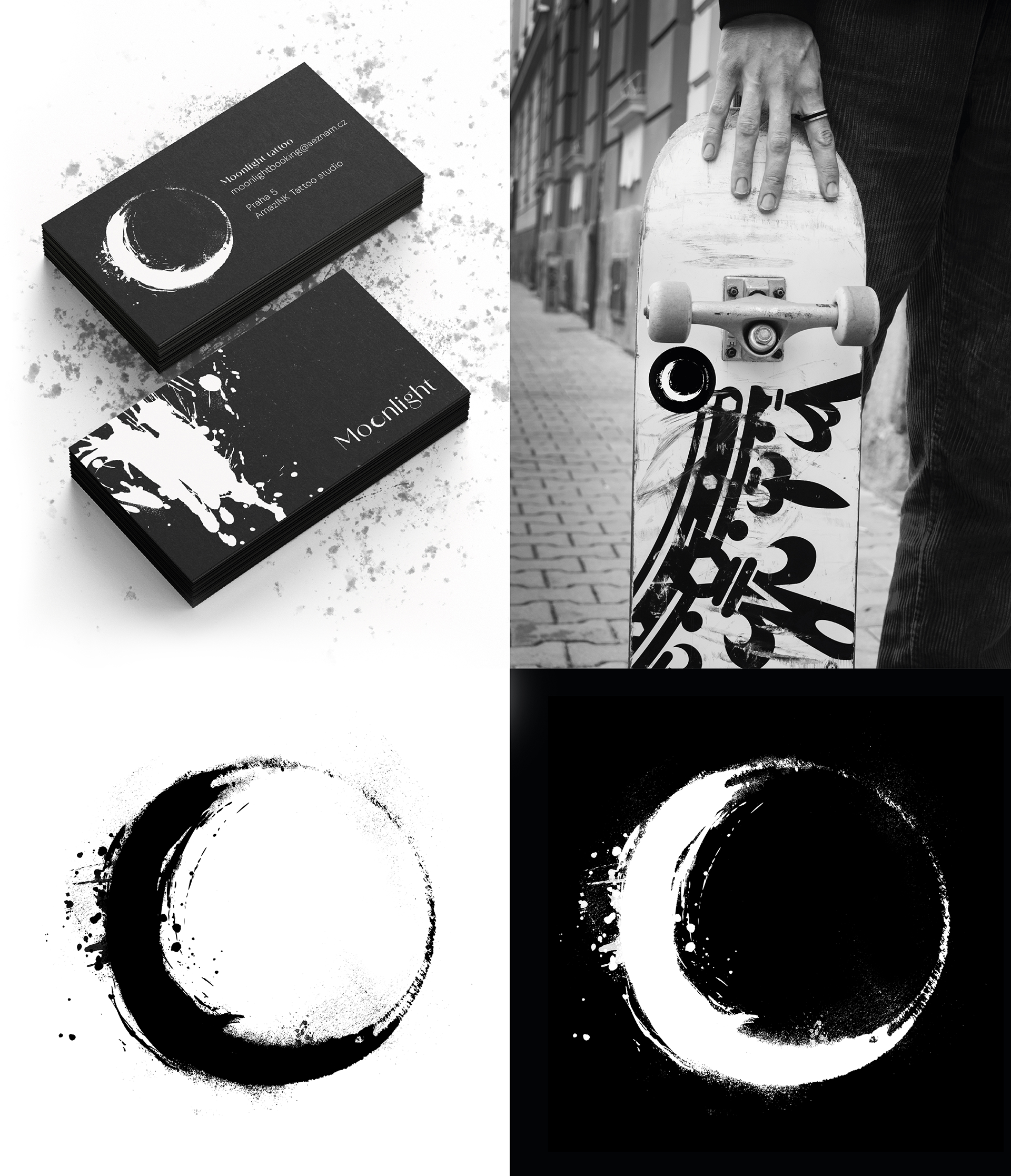 I created an illustration of the moon inspired by the name of the tattoo artist – Moonlight. The moon was designed in the style of spilled tattoo ink, which often spreads around the ink cup during tattooing. The illustration was then applied to business cards and the logo, and round stickers were also made for all the tattooed clients.