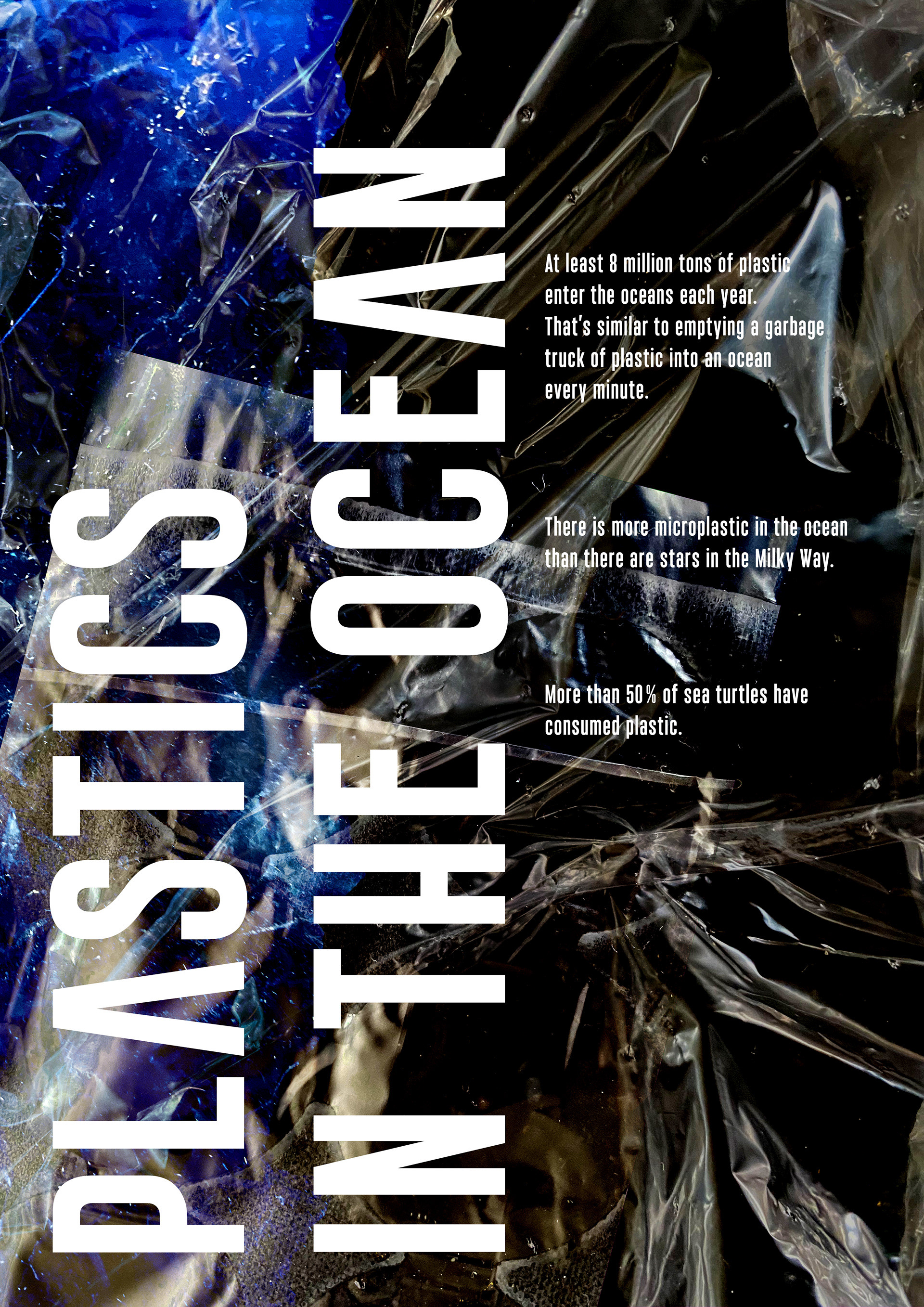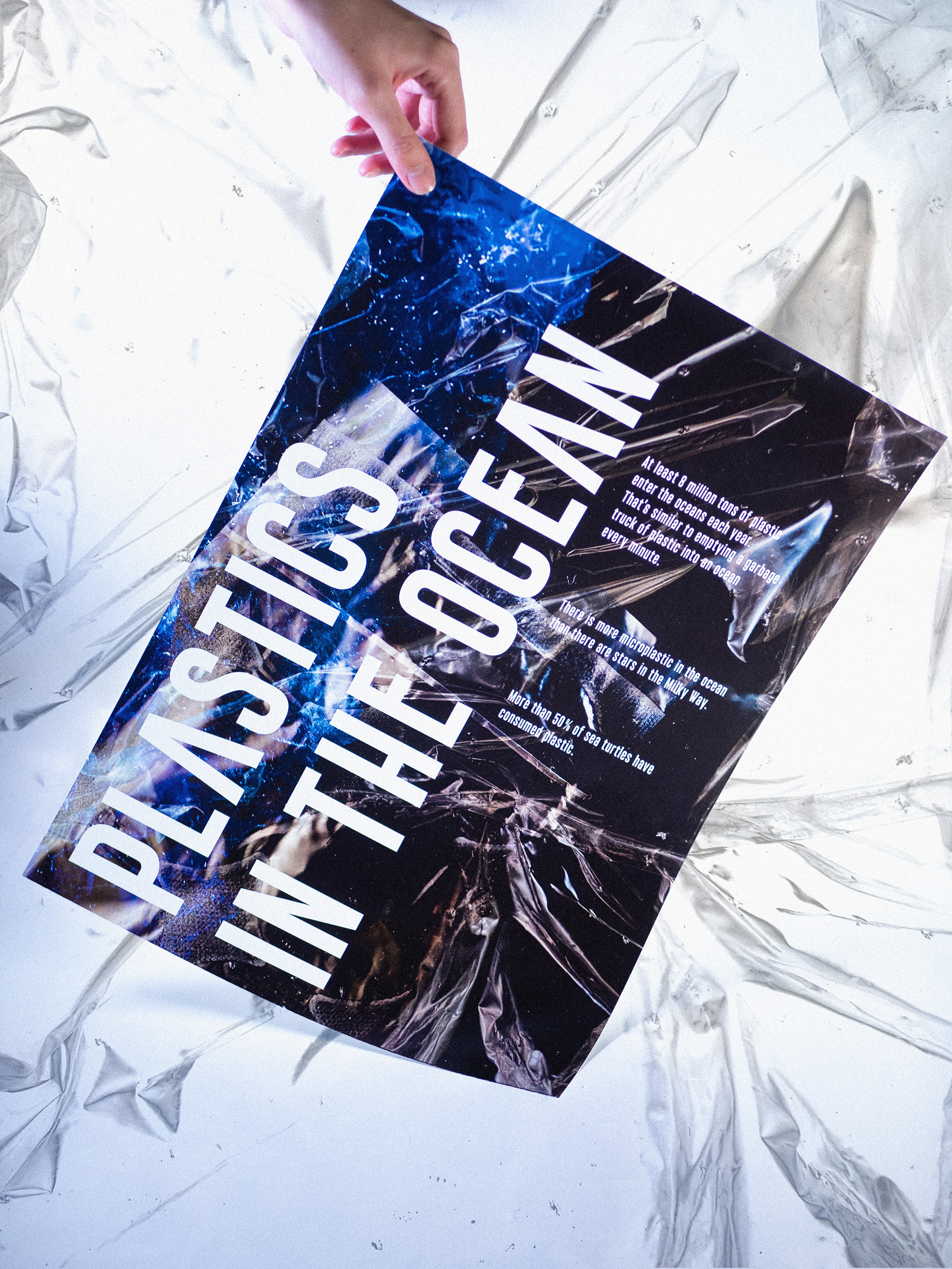 Poster on the topic of plastics in the ocean, made with my own photos and completed