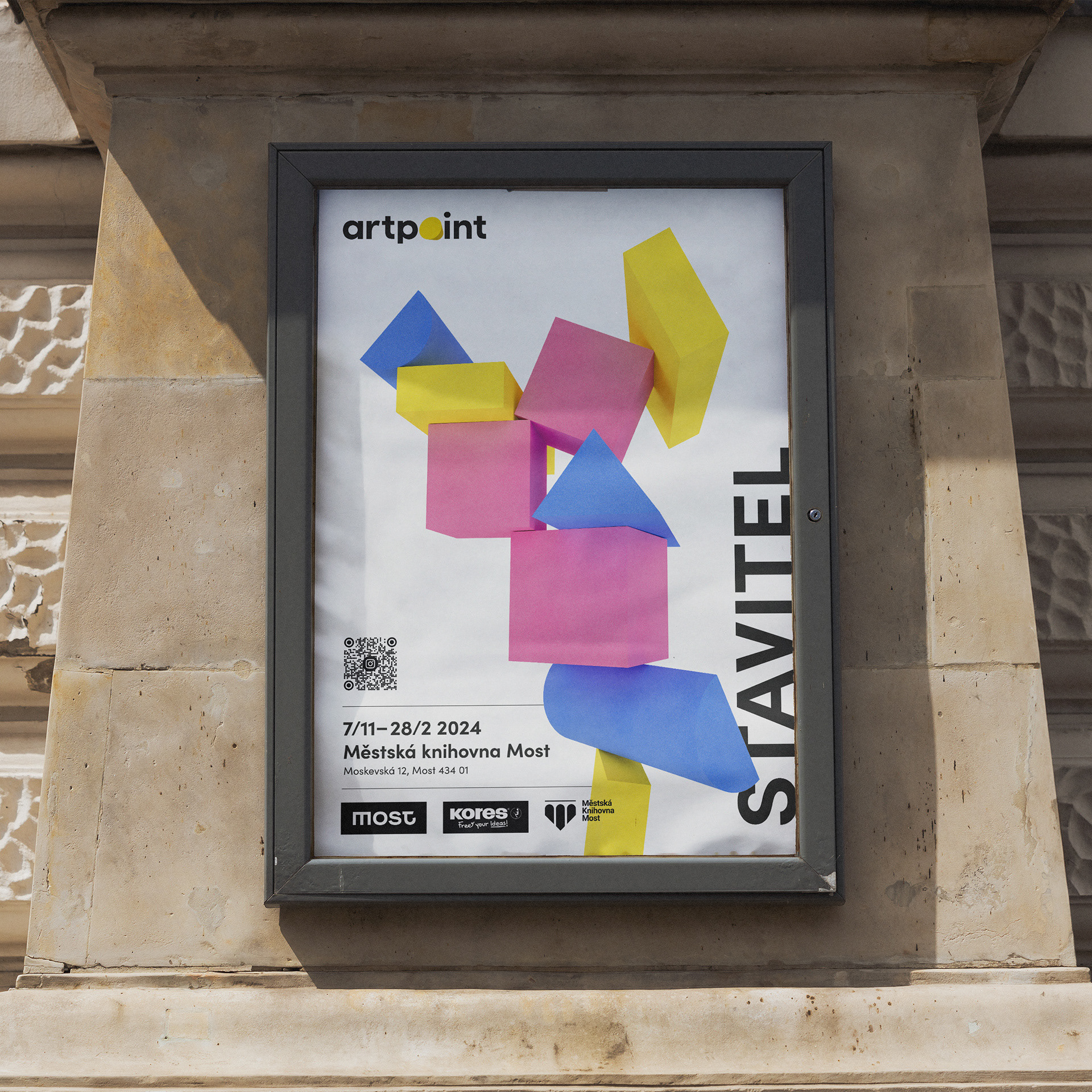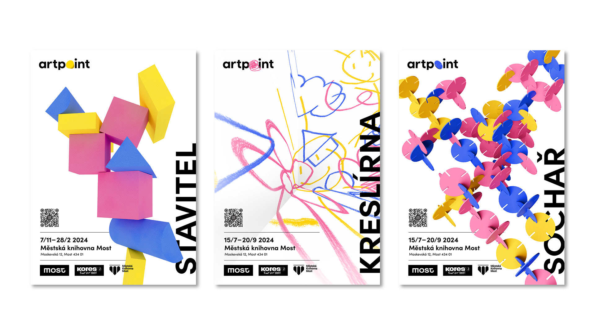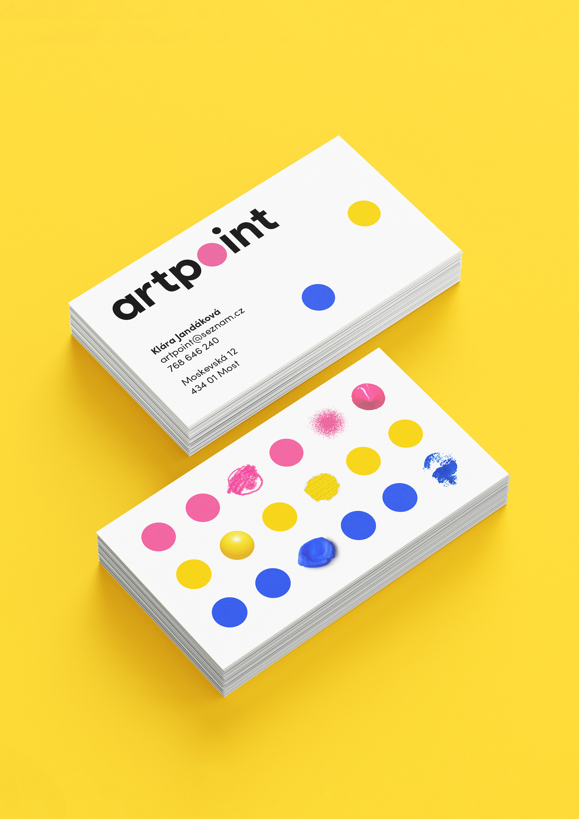 Artpoint is a leisure centre in Most for the artistic development of children and young people. It uses the principle of open studio, where the workshop is also an exhibition hall. The creativity is directed by seasonal themes that define the art mediums to be used. We respond to this principle via a variable logotype, where a dot formed by the chosen medium is inserted instead of the letter "o". The coherence of the design is ensured by a limited colour palette and a fixed typographic composition.