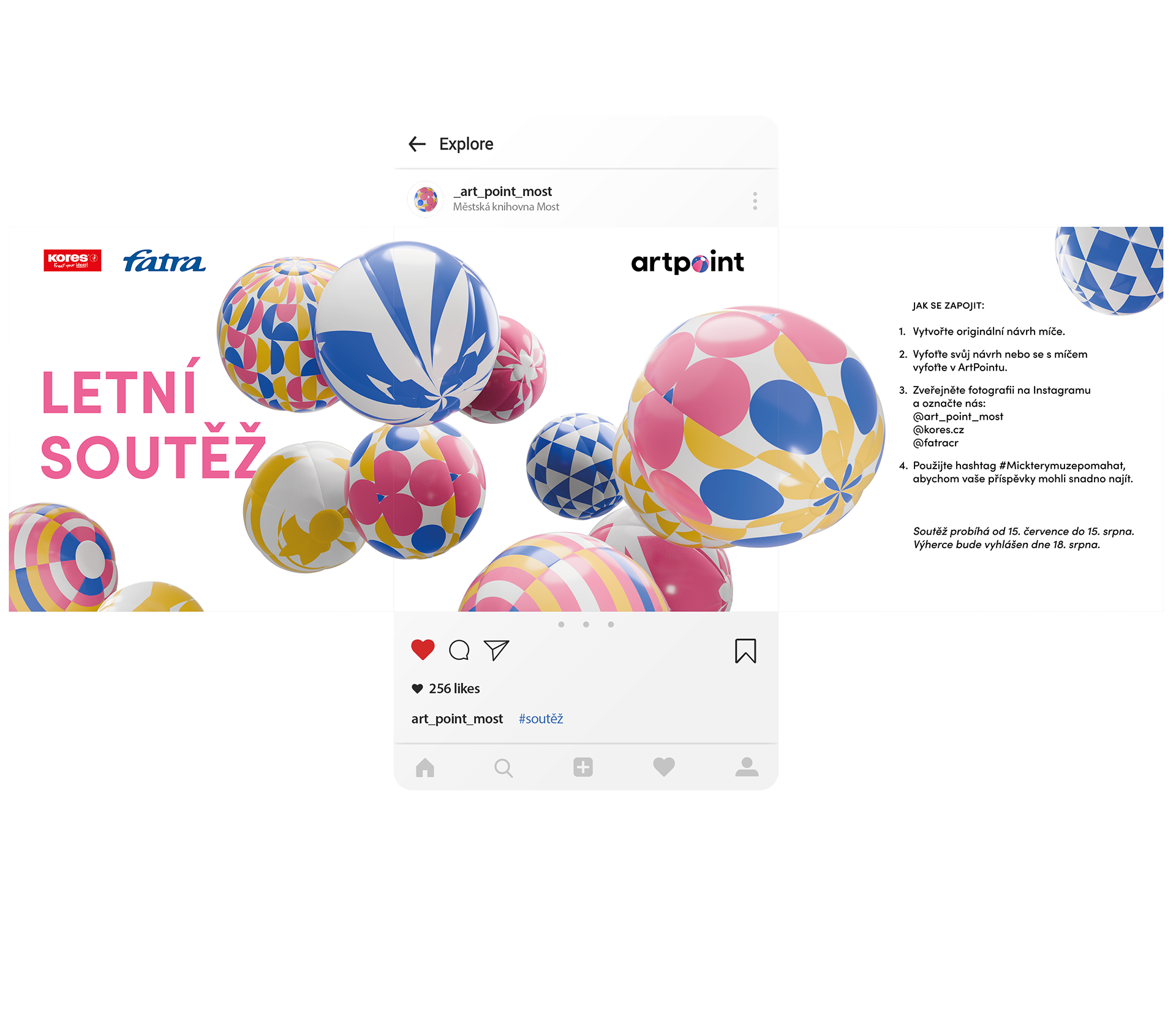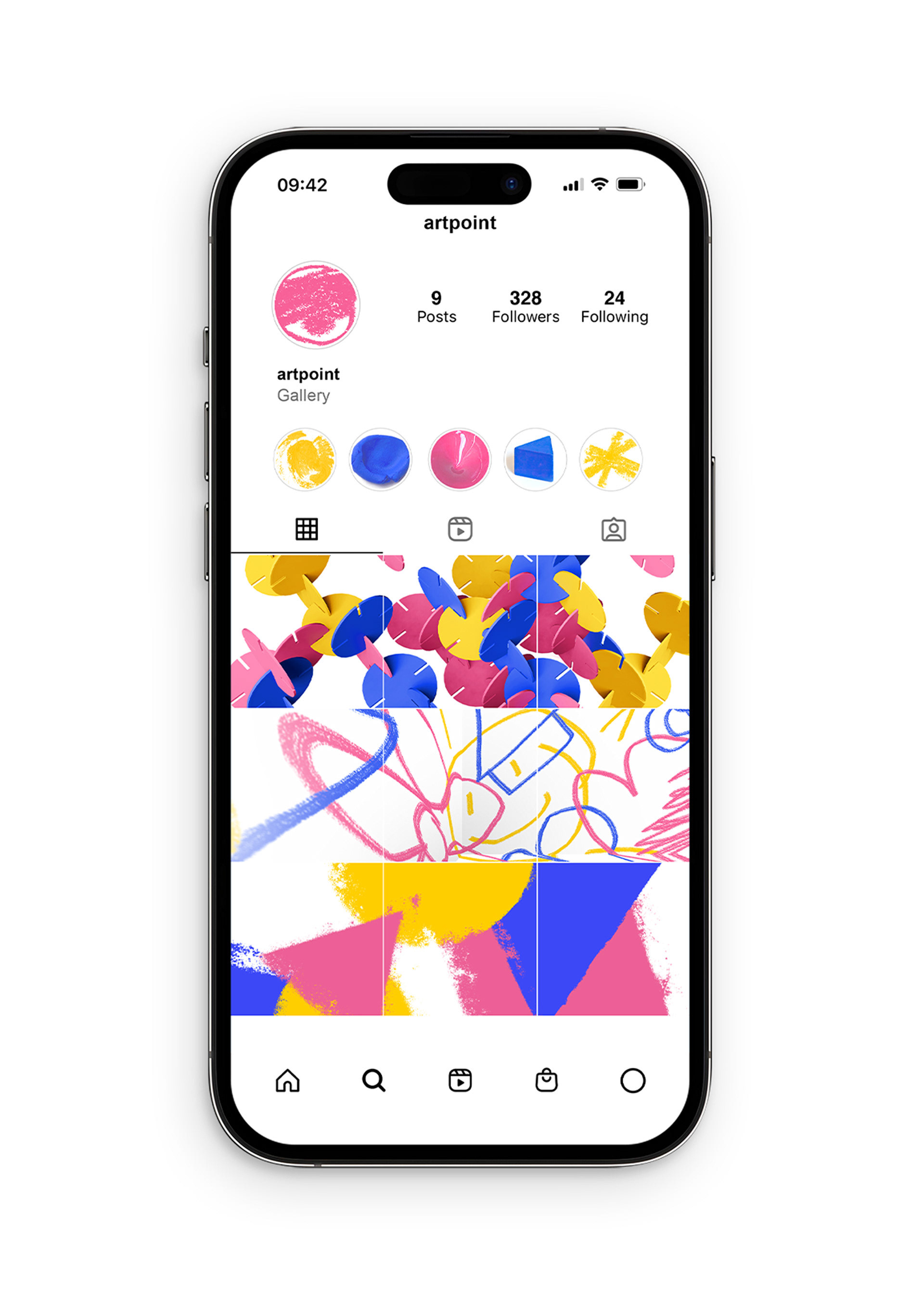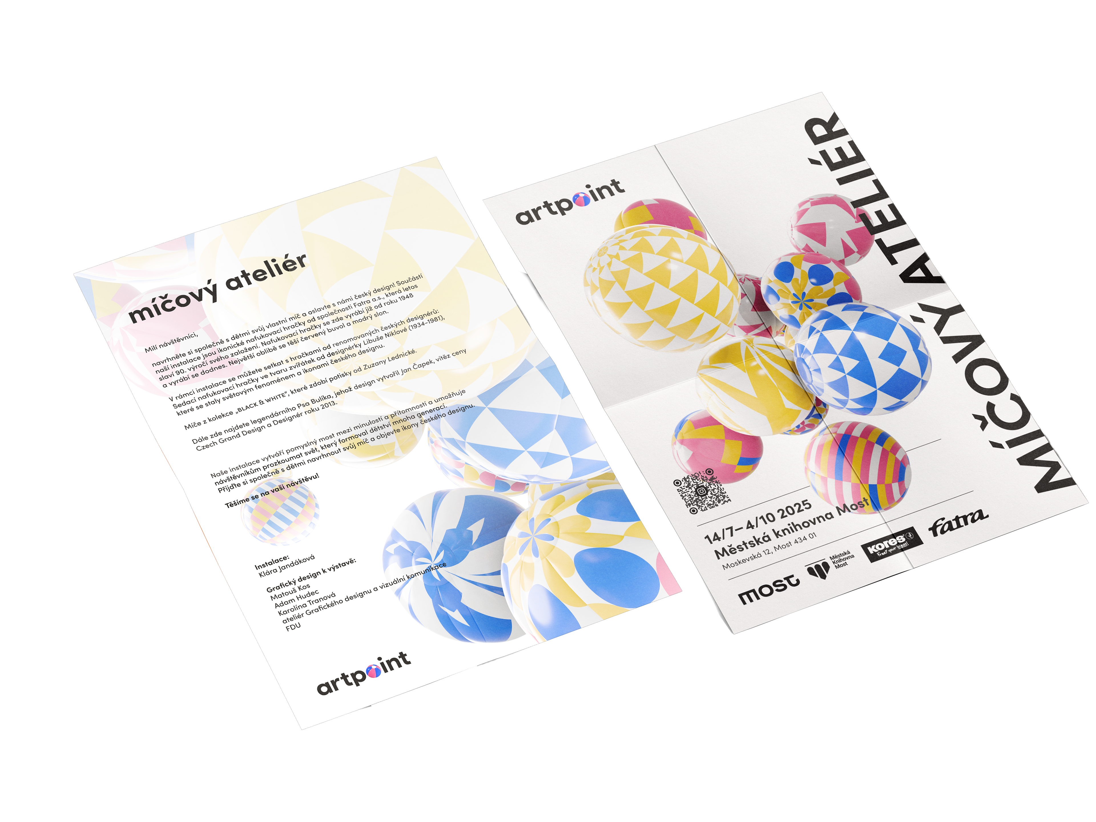 Artpoint is a leisure centre in Most for the artistic development of children and young people. It uses the principle of open studio, where the workshop is also an exhibition hall. The creativity is directed by seasonal themes that define the art mediums to be used. We respond to this principle via a variable logotype, where a dot formed by the chosen medium is inserted instead of the letter "o". The coherence of the design is ensured by a limited colour palette and a fixed typographic composition.